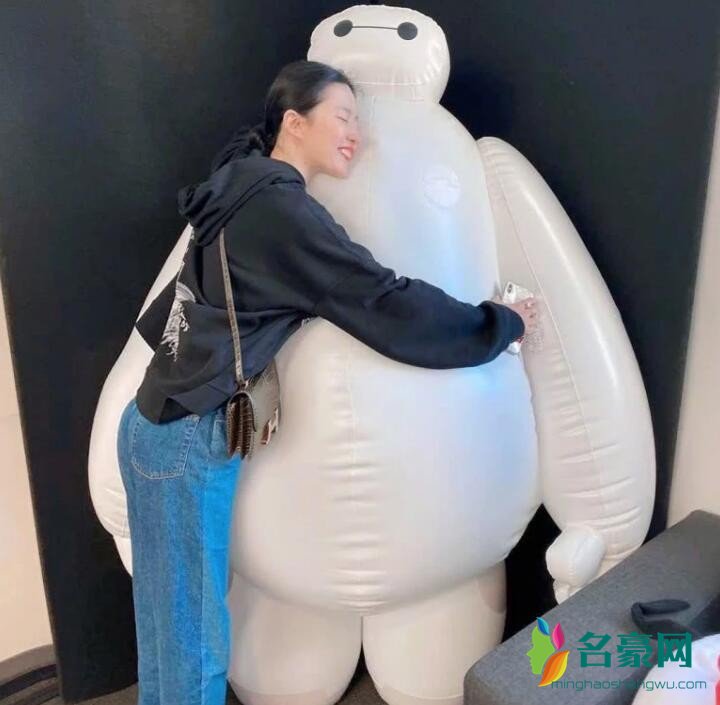 照片中,刘亦菲衣穿打扮十分休闲,她身穿一件黑色连帽衫,下身穿了条牛仔裤,青春气息十足。她整个人趴在大白玩偶身上,脸上挂着开心的笑容,尽显俏皮可爱。