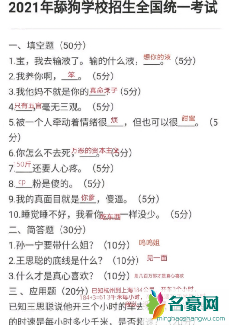 王思聪舔狗舔到一无所有后,就开始准备撕孙一宁,可万万没想到孙一宁曝光了两人的聊天记录。于是,全网都在来王思聪的土味情话来调侃,还流传了一张2021年舔狗学校招生全国统一考试试题,如果你不知道答案的话,可以看看本站带来的介绍。