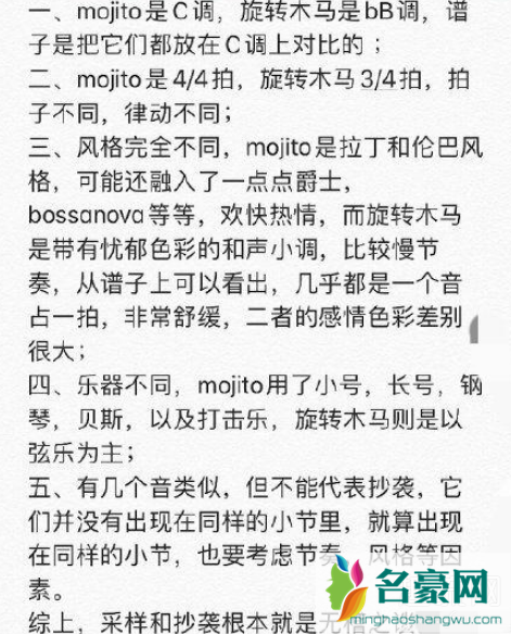 另外《Mojito》的编曲黄雨勋老师已经出面解释过,撞了一点旋律是真的,但抄袭纯属无稽之谈。其实这种事在音乐圈真的很常见。经常会出现两首毫无关联的作品撞旋律,而就目前的情况来说,严格意义上的抄袭最少需要八小节雷同,只要不是刻意抄袭,基本上光凭撞旋律是不可能这么大段相似的。所以大家不必过分纠结,《Mojito》这首歌就是单纯的编曲和《人生的旋转木马》撞了一点旋律而已。