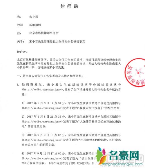可能是被指控抄袭的次数太多了吧,别人不烦大张伟自己都开始烦了,于是在9月13日下午,大张伟工作室发布律师函反告宋小君捏造事实,称其侵犯大张伟的名誉权:“请侵权主体立即停止侵权,删除全部侵权信息,否则我们将通过法律途径追究侵权主体的全部法律责任 !”然而截止到目前为止控告大张伟抄袭的原博主宋小君尚未有任何回应,不知道是不是受到了律师函准备打官司呢?