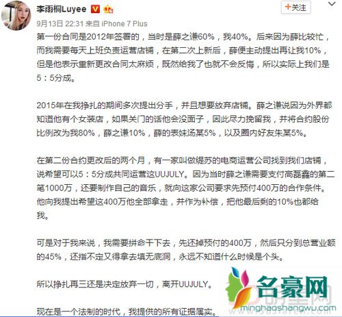 9月12日晚,网红李雨桐在微博上发长文爆料薛之谦骗钱骗感情,随后多名网红发声支持,紧接着有人质疑李雨桐与薛之谦并非合作关系,她只是薛之谦聘请的模特,针对此事昨晚李雨桐放大招,晒出实锤照片,力争自己合伙人的身份,打脸薛之谦的粉丝。从李雨桐晒出的合照中来看,2012年签署第一份合同时,她从4/6上升到5/5分成,等到2015年她打算放弃离开时被薛之谦挽留,合约股份比例改为李雨桐80%,薛之谦仅占10%,朱姓合伙人占有5%的股份,这位朱姓合伙人明显就是薛之谦的好友朱桢。