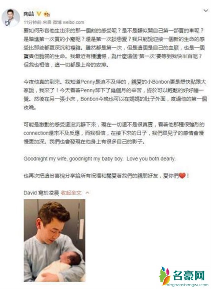 2月14上午,著名歌手陶喆在某社交平台上,晒出自己抱着孩子的照片,陶喆宣布儿子出生,向粉丝们公布了这一喜讯,并言语中掩饰不住的开心,照片中抱着孩子的陶喆眼中满是欣喜和宠爱,想必他也是期待这个小生命的到来很久了。
