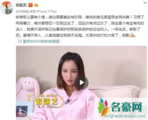 实际上张歆艺也没想到这件事情会闹这么大,9月1日她同样发微博回应此事,怒斥媒体断章取义,说:“断章取义要有个度,舆论需要真实地引导”,之前每次忍一忍都过去了,但这次有点过分了,她想要保护好哪些该保护的过往和人,所以这场乌龙就都散了吧,最后还肯定的说:“爱情不丢人,认真地爱过就绝不后悔。”之前看到她被骂的粉丝这下纷纷前来支持她,毕竟张歆艺说的只是后悔过往坎坷经历,又没有说后悔结婚后悔离婚,大家不要想太多了。