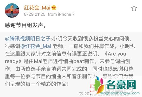面对外界的争议,8月29日“红花会_Mai ”个人微博针对抄袭事件作出回应,表示这两首涉嫌抄袭的歌曲作词作曲者并不是他本人,自己只是做了伴奏音乐,如果“说编曲像,我无法理解,无稽之谈,可以大家自己听一下。”在红花会mai本人做出回应后不久,《明日之子》与“嘻哈制作人公会”官方微博均发声明替他澄清,声明里的大概意思就是说mai没有参与两首歌曲的词曲创作,他并未抄袭。