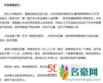 对于郭敬明的传闻真的是非常的多,毕竟郭敬明的身体上的缺陷是大家都知道的,但是并没有任何的女朋友,最近传出的就是和男明星之间的关系非常的不正常,可是当事人都是极力的反对和出面澄清。但是这次的时间就不一样了,这位发长文称郭敬明性侵的作家还是郭敬明旗下的作家李枫,那么李枫究竟为什么会有这样的做法,还把两个人之间相处的模式说的那么的清晰,对于郭敬明的性侵的事情,网友也表示只是吃惯群众,当事人郭敬明已经在微博回应,称李枫完全是在诽谤和捏造,称这件事情已经交到法律处置,不知道是真是假,但是能够交给法律处置,应该是李枫说的某些不是真实的吧!
