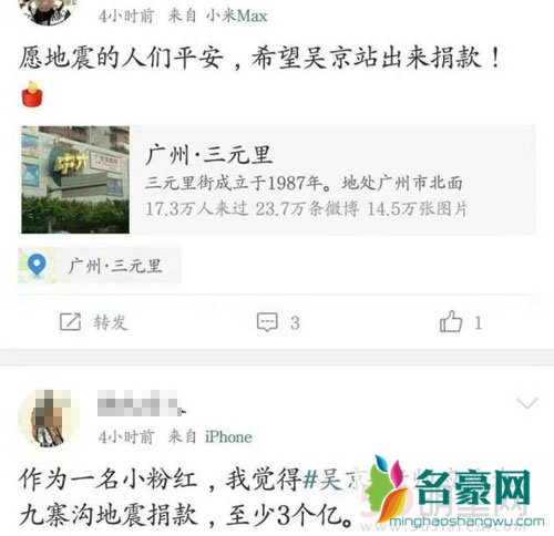 在吴京祈祷灾区人民平安的微博下,不少网友都在道德绑架他,留言称:“那么高的票房、那么高的利润,吴先生打算分多少钱给灾区?”“我觉得吴京老师应该为九寨沟地震捐款至少3个亿。”先不说《战狼2》目前的票房分成还没到吴京手里,就算到他手里了,这钱也不是他一个人全拿的啊,现在逼着吴京捐钱,说白了就是道德绑架,可即使如此吴京还是默默的捐了100万,而那些逼捐的网友又捐了多少呢?