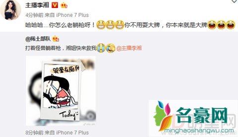 章子怡也很快微博发文称:“打着怪兽躺着枪,湘姐快来救我。”似要澄清传闻并喊话李湘求救,之后李湘也发文称:“哈哈哈,你怎么老躺枪呀!你不用耍大牌,你本来就是大牌。”其实也难怪网友们怀疑是章子怡,毕竟章子怡的大牌一直都有传言,春晚章子怡还不参加彩排,成为春晚史上最大牌的明星,最后穿着一身粉红的蓬蓬裙唱了一首《天女散花》,平时接个电话自己都不拿,飞机上使唤空姐等,所以这次躺枪也不亏。