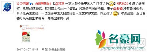 所谓人红是非多,吴京导演的电影《战狼2》近日连创票房纪录,已经突破30亿大关,影片中所呈现的酣畅淋漓的战争场面也令人振奋,而故事情节中折射的爱国主义精神也让观众们热血沸腾。但是最近却有一名认证为“卫星天线的微博”爆料,称吴京一家人都并非中国大陆国籍,并借此嘲讽道:“抛弃中国大陆籍的人教育你爱国,你还信了?”微博出来之后不久,吴京妻子谢楠的母亲就晒出护照辟谣,江苏警方也给予警告。