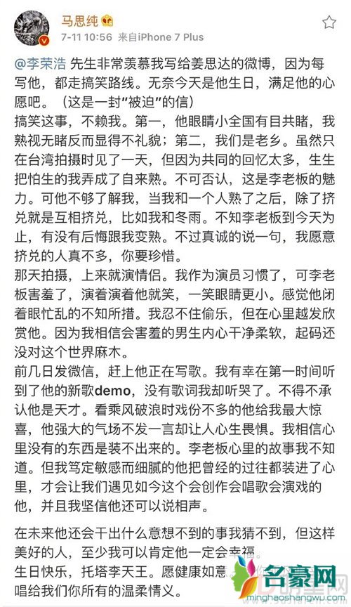 事实上除了正牌女友杨丞琳发博送祝福以外,作为李荣浩好朋友的马思纯也为他写了一封信,在心中她用诙谐的语言转达对李荣浩的欣赏,“第一,他眼睛小全国有目共睹,我熟视无睹反而显得不礼貌;第二,我们是老乡。”还谈到两人一起合作演情侣戏的经历,看到害羞到闭眼的李荣浩,马思纯表示:“因为我相信会害羞的男生内心干净柔软,起码还没对这个世界麻木。”信的最后送上真挚的生日祝福:“生日快乐,托塔李天王。愿健康如意。”看到这封信网友纷纷表示希望二人友谊长存。