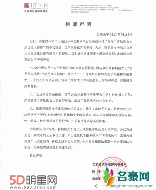 7月7日,蒋勤勤所在经纪公司君为天美官方微博发布声明,怒斥多家媒体和个人通过互联网平台捏造消息,称蒋勤勤女士“涉足他人情感”,并用“小三”这样带有侮辱性字眼的文字称呼,声明中提到这些行为严重侵犯了蒋勤勤的名誉权,对其造成恶劣的影响,要求此类文章的发布者、转载者以及相应网络服务平台立即删除、停止转发,消除不良影响,他们已经委托律师处理此事,将采取一切必要的法律手段,坚决追究侵权者的法律责任。
