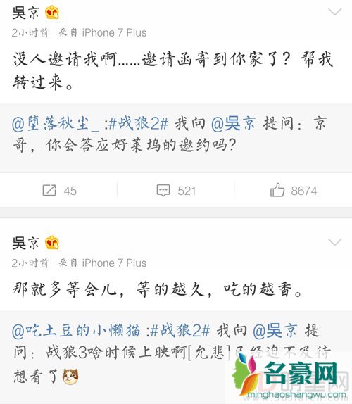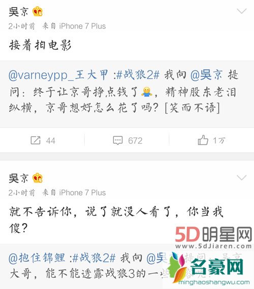 因为《战狼2》的走红,吴京可谓是被推往了风口浪尖,这几天不时有各种黑料抹黑他,就比如说什么中戏的老师质疑战狼啦,还有吴京一家人的国籍问题啦,最近还传出吴京因《战狼》受到好莱坞的邀约,针对此事吴京今天接受微博提问时一一回应,否认收到好莱坞邀请的消息,并透露接下来的工作计划。