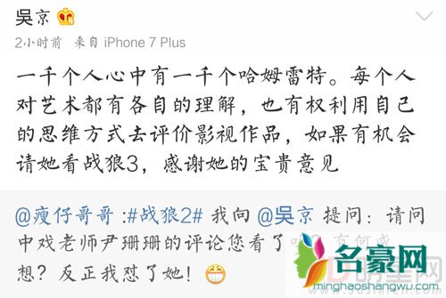 8月17日下午,凭借《战狼2》名利双收的吴京做客微访谈,回应了多个网友提出来的问题,其中就有网友问到之前中戏老师尹珊珊对《战狼2》的质疑,这位老师炮轰《战狼2》贩卖暴力,并质疑作者吴京是否有心理变态,在网上引发不少网友热议,面对该提问吴京大方回应:“一千个人心中有一千个哈姆雷特”,并称“有机会请她看《战狼3》”,坦然的态度又圈粉无数。至于被问是否会接受好莱坞邀约时,吴京开玩笑说:“没人邀请我啊。邀请函寄到你家了?帮我转过来。”