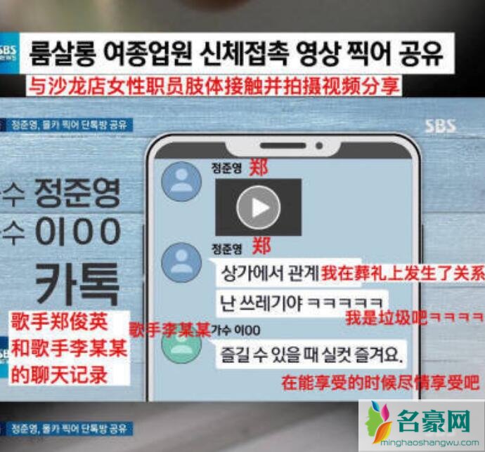 在曝光的群内聊天记录来看,郑俊英不但私下向群内其他成员炫耀自己与多人发生过关系,并且还将发生时的视频发布在群内,以供其他群成员们观看。在上图曝出的聊天截图中,蓝色头像的为歌手郑俊英,而绿色的头像为朋友金某某。而除了在群内发布大尺度视频之外,郑俊英还经常在胜利的夜店内,拍摄自己与女性职员肢体接触的视频,并且在拍摄完成之后将这些视频分享到群内以示炫耀。而截图中除了有郑俊英的聊天外,也有歌手胜利的聊天内容,上图中绿色头像的李某某便是歌手胜利(原名李胜贤)。而郑俊英不但发布视频炫耀,而且地点也是让人大跌眼镜,竟然在葬礼这样严肃的场合上都有,而胜利对于郑俊英的炫耀也给出积极的回应,称在能享受到的时候尽情去享受。