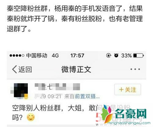 最近网上贴出一张杨紫被秦俊杰粉丝谩骂的截图,正当不少网友一头雾水的时候,有人出来讲解事情经过了,原来日前秦俊杰空间自家粉丝团,女友杨紫当时就在他旁边,所以就用男方的手机发了语音与粉丝互动:“谢谢你们喜欢他,喜欢他的同时也要喜欢我呀。”随后秦俊杰也玩笑称:“她让你们退了这个群去她的群。”没想到这一下会惹来秦俊杰粉丝的嘲讽,不仅有人愤怒脱粉,有几位管理员退群等等,还有人对杨紫进行辱骂,指其“倒贴”,女友粉激烈的评论:“是自己没粉丝么!”