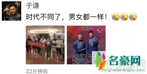 近日著名相声演员于谦近日和德云社的张鹤伦、曹鹤阳、郎鹤炎、栾云平、高峰等人到日本东京举办“KISS FUKUOKA 2017德云社全球巡演日本首演”,由于航班晚点所以让等待在东京羽田机场的粉丝们守候了近四个小时,到晚上9点半左右的时候众人才从出口走出,当于谦看到粉丝们的标牌时瞬间大笑。在与粉丝们合影之后于谦被记者问到:”和上周迎接郭德纲的清一色女钢丝比起来,今天的谦丝几乎都是男生,这是为什么呢?”于谦幽默地回答:男女都一样。