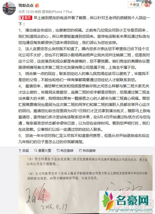 王自健前妻在微博上的回应暗指对方撒谎,说“第二班”在离婚协议里写清楚了是属于她,而王自健却在微博里假装不知情,在她晒出的部分离婚协议书中,上面的日期显示两人是在2016年11月离的婚。至于第二班法人变更事宜,其前妻质问“您怎么突然就不知道了,咱们商定的离婚协议里面很明确写着北京第二班文化发展有限公司是属于我。”不仅如此前妻还开撕王自健,暗指他成名后膨胀:“从你开始逐渐成名后这几年我们的日子是怎么过的你我都清楚。”随后王自健以“呵呵”二字回应。