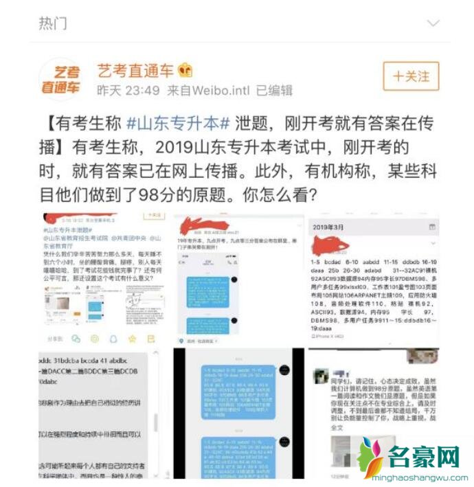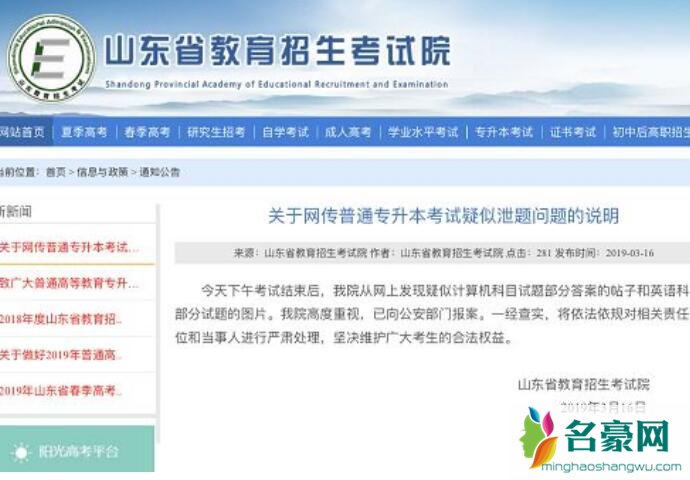 据山东共青团官方微博3月17日凌晨消息,网友私信曝光,2019年山东专升本考试试题泄露。考试9点开始,9:03已有试题部分答案公布在相关群里,英语部分试卷照片也在网上传播。山东省教育招生考试院发布情况说明称,3月16日下午,普通专升本考试结束后,山东省教育招生考试院从网上发现疑似计算机科目试题部分答案的帖子和英语科目部分试题的图片。省教育招生考试院高度重视,已向公安部门报案。一经查实,将依法依规对相关责任单位和当事人进行严肃处理,坚决维护广大考生的合法权益。