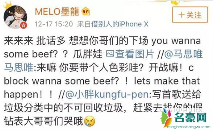 随即,说唱会馆几位大佬之一的TY,开始为兄弟鸣不平,只不过显然并不想开撕。之后Ranzer转发Knowknow发票微博,嘲笑海尔兄弟,并且表示自己在罗斯柴尔德银行喝过咖啡。就在这个时候活死人厂牌主理人法老加入了战场,点赞了Ranzer微博并且发出微博嘲讽马思维,之后粉丝嘲讽法老加入海尔兄弟粉丝群,被管理员踢了的这件事,海尔兄弟更是发出法老唱海尔歌曲的视频打脸法老。