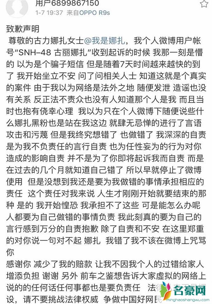 公告显示,据悉,该用户在2017年6月至2018年8月31日共发表497条微博,诽谤娜扎的微博超450条,娜扎方考虑到被告无业,将赔偿金从55万减至2.5万。另外,被告已于7日晚发布致歉声明并置顶。对此,粉丝也纷纷表示解气,支持娜扎维权,同时也对娜扎因考虑到对方无业,将原本的55万减至2.5万进行了赞赏,夸赞娜扎善良。