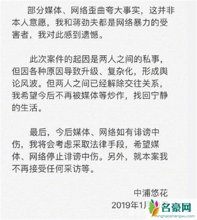 就在昨日,中浦悠花也表示自己接受了这个结果,并且表示两人到了今天这个地步的原因是因为爱情观差异大,而且蒋劲夫也道歉过了,并且自己也接受了,所以也不打算起诉蒋劲夫了,并且还表示是自己当时做出的反应有点过分了,觉得两人都是网络暴力的受害者。