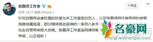 随着《白鹿原》开播,微信公众号发布的这篇文章令张嘉译工作室坐不住终于发布了声明,在该声明里不仅否认孙铱和张嘉译为师生关系,同时也称工作室并未签约孙铱。表示:“部分媒体就此延伸的一系列八卦传闻,都是子虚乌有,给张嘉译先生名誉带来极大伤害。”希望原作者以及转载的博主能尽快采取撤稿,关闭网络链接等方式停止侵权行为,并向张嘉译先生赔礼道歉并赔偿损失。