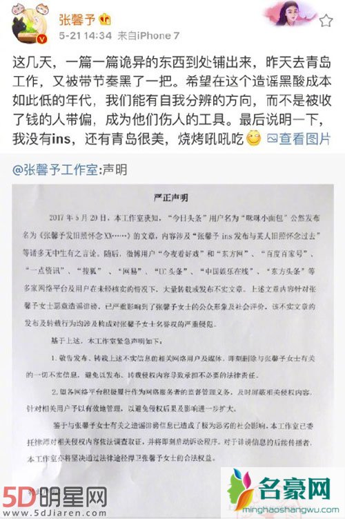 5月20日是出了名的“我爱你”告白日,无论是明星还是普通人都会选择在这一天与心爱的人表白,不过这时候网上突然出现了关于《张馨予发旧照怀念李晨, 最后一张无言以对》的文章,随着多家媒体的转载传播,该文章被越来越多网友注意围观,21日张馨予工作室发布声明澄清此事,怒斥该消息“无中生有,恶意造谣诽谤”鉴于这些消息已经造成了极其恶劣的社会影响,严重侵犯了张馨予的名誉权,所以工作室将采取法律手段,即刻启动诉讼程序。