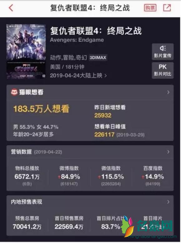 复联四预售票房破7亿也成为了中国影史映前总预售新纪录。其中,万达影院的首映票房高达3000万,比CCV高出了4倍之多。如今《复联4》可谓是一票难求,还有不少网友想要观看《复联4》。