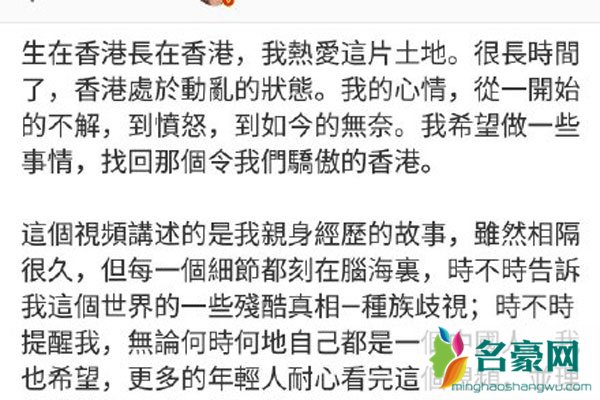 在最近微博中向佐说:生在香港長在香港,我熱愛這片土地。很長時間了,香港處於動亂的狀態。我的心情,從一開始的不解,到憤怒,到如今的無奈。我希望做一些事情,找回那個令我們驕傲的香港。這個視頻講述的是我親身經歷的故事,雖然相隔很久,但每一個細節都刻在腦海裏,時不時告訴我這個世界的一些殘酷真相—種族歧視;時不時提醒我,無論何時何地自己都是一個中國人。我也希望,更多的年輕人耐心看完這個視頻,並理解我的歸屬感,從而找到屬於自己的歸屬感。願憑著我們每一個香港人的努力,還原這顆東方之珠的光芒。一名中國香港市民!