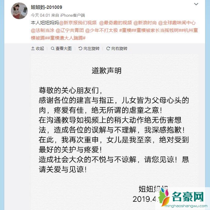 4月9日,有网友称,杭州一女童模被一名成年女性踢踹。据童模合作商家表示,该女子为女童“妞妞”的妈妈,“妞妞”模特与多家店铺合作,接单量大。杭州市妇联法律援助律师王楠称,该踢踹行为有可能涉嫌家庭暴力。好多人关注都是踢一下没什么大不了,重点是拿小孩子挣钱,这爹妈就跟蛀虫一样,自己不会去挣钱啊,没本事就去搬砖啊!利用小孩还有脸撒泼了。