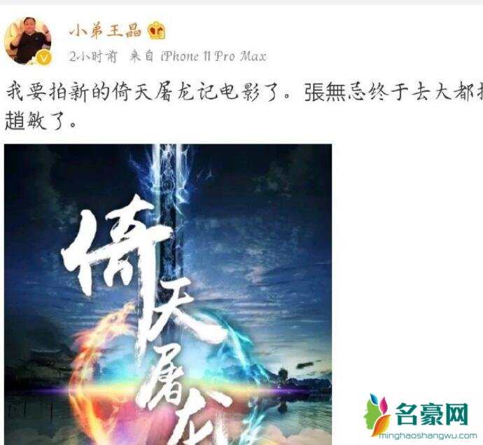 正所谓念念不忘必有回响,现在,影迷的愿望终于要实现了。12月21日中午,香港导演王晶在微博宣布自己将拍摄新的《倚天屠龙记》电影了,称“这一次张无忌终于去大都找赵敏了”。此外,王晶还在微博中晒出了《倚天屠龙记》的海报照片。