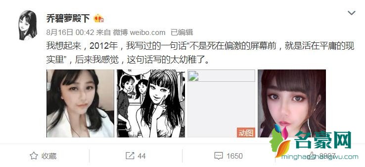 8月16日深夜,乔碧萝在微博上晒出了一组生活照,并且感叹道:“不是死在偏激的屏幕前,就是活在平庸的现实里”,后来我感觉,这句话写的太幼稚了。看来如今乔碧萝疑似对所做行为感到后悔。
