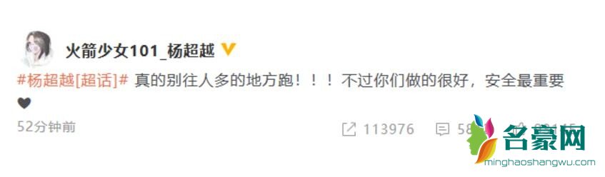 杨超越表示:“真的别往人多的地方跑!不过你们做的很好,安全最重要。”因为现在疫情原因,所以去人多的地方是非常危险的,所以为了大家的人身安全,不要到人多的地方为好。