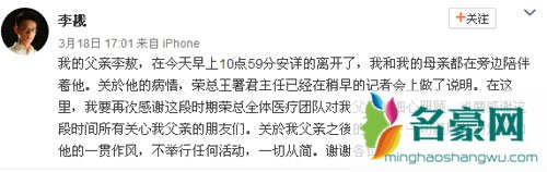 3月18日上午10点59分台湾作家李敖安然离世,享年83岁,台北荣民总医院证实发出通知,将于当天下午2点召开记者会,家属也将出面说明,18日下午李敖的儿子李戡发微博感谢医疗团队的照顾以及所有关心父亲的朋友。至于父亲之后的安排,李戡决定遵照他的意愿和他的一贯作风,“不举行任何活动,一切从简。”李敖是台湾著名作家、诗人、文学评论家、因其文笔犀利、批判色彩浓厚,嬉笑怒骂皆成文章,所以自诩为“中国白话文第一人”。
