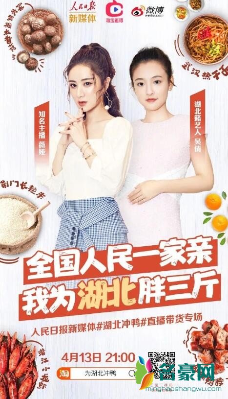 4月13日晚,人民日报联手薇娅推出为#湖北冲鸭#直播专场,还有当红演员,湖北籍演员、武大校友吴倩做客。本场“湖北冲鸭”直播带货专场,主要销售周黑鸭的鸭脖、鸭翅、鸭掌、鸭舌、鸭锁,均一上架秒售罄!