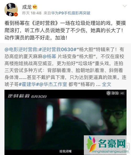 家喻户晓的动作片演员成龙此次作为《逆时营救》这部电影的监制,他转发杨幂打戏片花后毫不吝啬的夸奖:“看到杨幂在《逆时营救》一场在垃圾处理站的戏,要摸爬滚打,听工作人员说她受了不少伤,她真的长大了!动作演员的路不好走,加油!”能够获得成龙的夸奖,最起码杨幂的敬业精神是很值得肯定的,随即杨幂本人还转发成龙微博,与其互动称:“谢谢大哥,以您为榜样努力!”