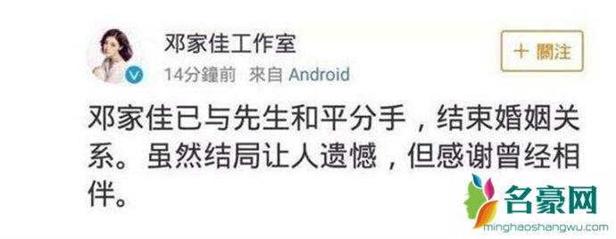 虽然说很多人对于两人的婚姻充满信心,但是二人在结婚后的第四年却宣布和平离婚让人大跌眼镜。而离婚的原因也十分普遍聚少离多这是娱乐圈恋情告终、婚姻失败的通病,无论是男演员还是女演员,为了不被观众遗忘,为了有知名度、有市场。不得不频繁接戏,常年呆在剧组,与老公缺乏沟通,并且邓家佳和于言结婚4年并没有孩子这也就少了一个婚姻的钮带。