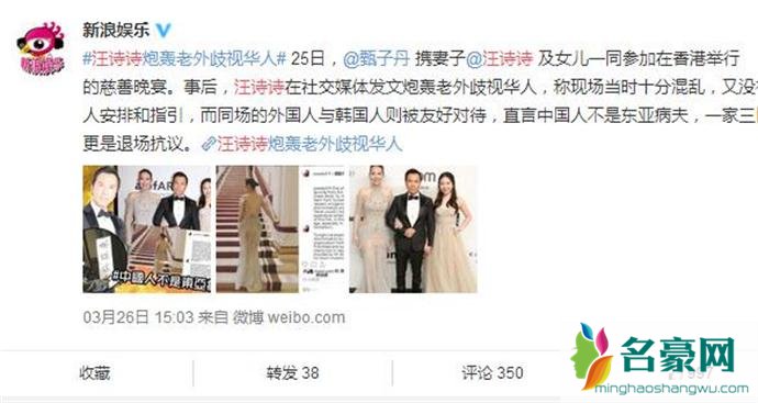 随后在3月26日,甄子丹的妻子汪诗诗突然在社交网络发文说明其此事,称一家人在香港受外国人歧视,愤怒的汪诗诗还打上“中国人不是东亚病夫”的标签。据汪诗诗透露,当日慈善晚宴主办单位是外国团队,主办方亦未有安排工人员作出正确指引,甄子丹一家进场时被工作人员拦住质问:“晚宴还没开始,为什么你们会进来?”并且汪诗诗还表示外国团队对外国人和韩国明星非常友好,和对待中国人完全不同。因此,她认为这种行为是在歧视中国人,使他们无法接受。晚餐尚未开始,甄子丹一家早早退场作无声“抗议”。