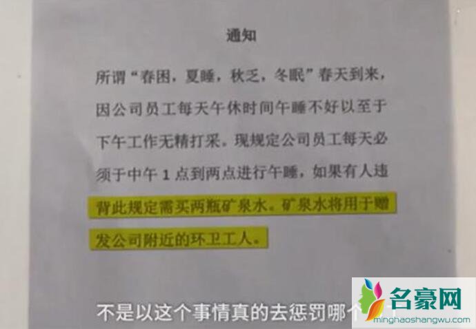 3月15日,在湖北武汉,一家公司下发的新规定,要求公司所有员工,在中午必须要午休一个小时,如果有人没有午睡,要给附近的环卫工人买2瓶水。这个规定以颁布,有人欢喜有人愁。一个没有午休的员工表示:这个政策是今天才开始实行的,自己第一天就已经被罚了2瓶水。其实这个规定并不合理,因为自己没有午睡的习惯,强行让我睡,我真的睡不着。有午睡习惯的员工表示:自己只是一个看客,因为自己本身就有午睡的习惯,自己觉得这个规定是蛮有意思的。