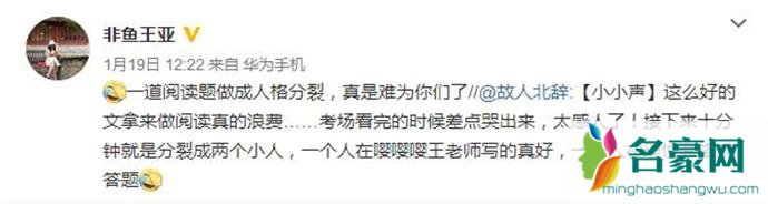 近日,苏州高二年级语文统考中,一道现代文阅读理解题目竟然把著作人给难倒了20分的阅读理解竟然只得6分这是怎么回事呢?原来16日晚,一名自称苏州的高二学生通过微博主动联系到王亚并且通过私信将当天语文统考的阅读理解题目发给了她。王亚当时觉得挺好玩的于是就把自己的答案发了过去结果在标准答案公布后她竟然只得6分!