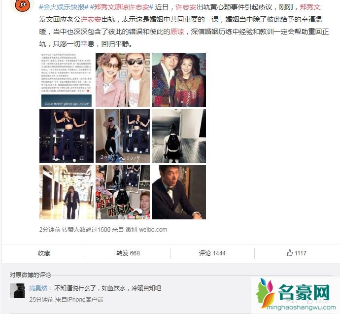 以上就是郑秀文在个人社交平台对于许志安一事作出的正面回应。而在此之前,尽管许志安在第一时间承认出轨黄心颖并没有遮遮掩掩回避此事让不少网友感到了许志安认错的态度,此后黄心颖也在个人社交平台认错,表示自己犯了天大的错,跟对不起马国明。此后马国明与郑秀文一样也选择原谅了黄心颖“她还年轻,希望大家多给她一些空间”。看来双方都想要尽快结束这场闹剧,祝各自安好。