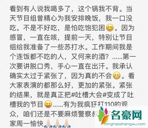 《吐槽大会》播出了这么多期,虽然也有嘉宾说的话很毒,但从来没有像马景涛这期一样整段垮掉,从他一开始上台就冲上去抱着刘嘉玲转了两圈,紧接着在刘嘉玲还一脸惊吓完全不知道发生什么情况的时候马景涛又咆哮着说节目组让他克制克制再克制,可他见了刘嘉玲就克制不了啊!然后直接抱着刘嘉玲的脸亲了上去,现场气氛一度超级尴尬,刘嘉玲在一旁也满脸不知所措。事发后马景涛发文道歉,表示自己当天并没有喝酒,承认第一次上脱口秀,尺度没拿捏好。