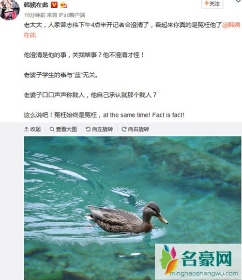 曾志伟表示此事已经进入司法程序,今后不会再做出任何回应。而在曾志伟这边召开记者会的时候,韩姨那边也火速发文:“他澄清是他的事,关我何事?他不澄清才怪”,同时韩姨也说大家没必要担心她,“敢公然批评就是确有此事,控告老婆子?坐等!”甚至还称“她已经七十多了,就算因此死了,除掉一个人渣,值!”丝毫不怕曾志伟的起诉,如此坦然的坦度倒叫人越发感觉韩姨说的属实。