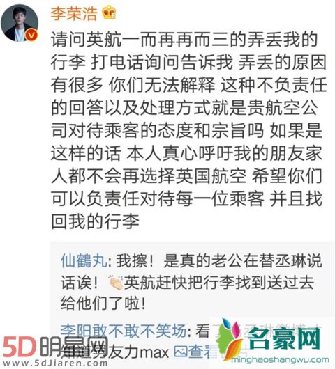 在杨丞琳发声后不久,男友李荣浩也发声支持女友,责问英航公司为何会一而再再而三的弄丢乘客的行李,打电话给英航公司询问,对方却告诉他行李弄丢的原因有很多,无法一一解释。之后李荣浩还表示如果这种不负责任的回答以及处理方式就是贵公司对待乘客们的态度和宗旨,那以后真心呼吁朋友和家人不要再选择英航公司,希望该公司可以认真负责的对待每一位乘客,并给杨丞琳找回行李。之后网友们对此围观留言,称李荣浩男友力满分,杨丞琳只能抱着李荣浩取暖了。