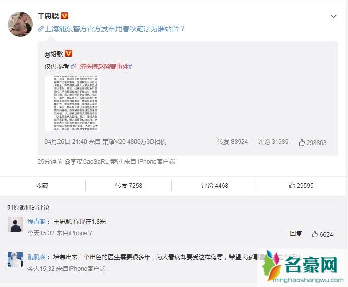 据目击者大妈说医患方自己头撞医院的柜子,随后报警。后面医生将其推出门诊室,就起了冲突吧,而赵医生似乎还被病患方推摔倒了。随后警方则来到,带走了赵医生,对此,不少网友都纷纷表示赵医生一个德高望重的老主任受到这样的对待,为人看病却要受这样侮辱,难怪王思聪胡歌纷纷站出来说话。