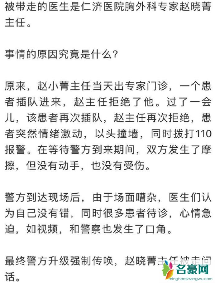 仁济医院赵晓菁事件是怎么回事?据悉,医闹事件频频发生,而最近在上海仁济医院发生了一件医患纠纷,随后的一段现场发生的医警互相推搡的视频,引发网友热议。事情的起因则是因为病患几次想要插队,但是医生让他们继续等待,而医患方则似乎不太讲理,居然为了正常的等待和医生发生冲突!