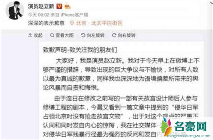 4月2日演员赵立新发表不当言论称:日本人占领北京八年,为什么没有抢走故宫里的文物并且烧掉故宫?这符合侵略者的本性吗?在网上引起一阵舆论风波,网友们纷纷指责赵立新不尊重历史,随后更是被各大官方平台点名批评,在媒体舆论的影响下赵立新发表道歉声明。