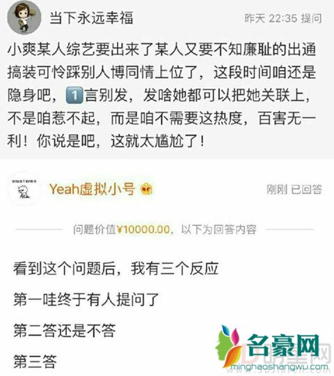对于这个网友的提问,郑爽回答到:“看到这个问题,我有三个反应,第一哇终于有人提问题了,第二还是不答,第三答!”对于郑爽的这次曝光回答问题,网友们众说纷纭,有的网友表示回答的都和问题不沾边,别人问的是隐不隐身,而不是回答不回答;也有网友喊出了大家的心声,价值一万元,比上次的六千还要多,郑爽这是有多缺钱啊,亲自下场带节奏,真的是厉害了“社会爽”。其实难怪网友会议论三人,实在都是奇葩,满身都是话题,招黑体质啊,洗都洗不白。