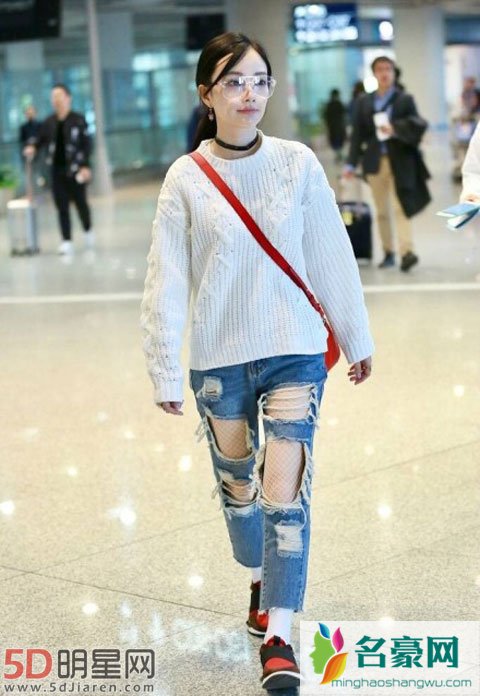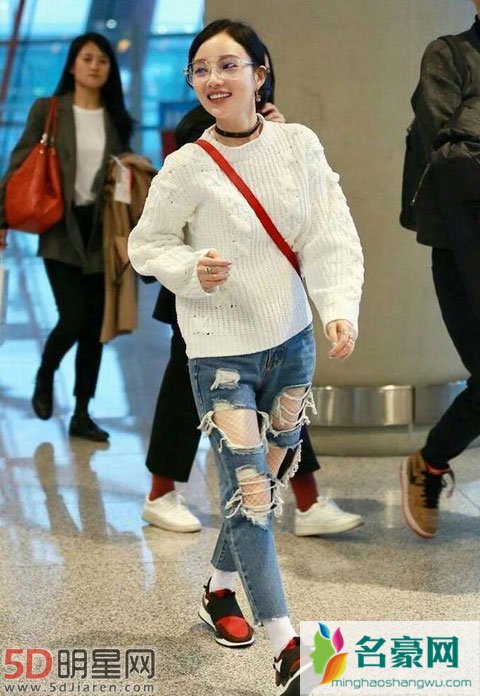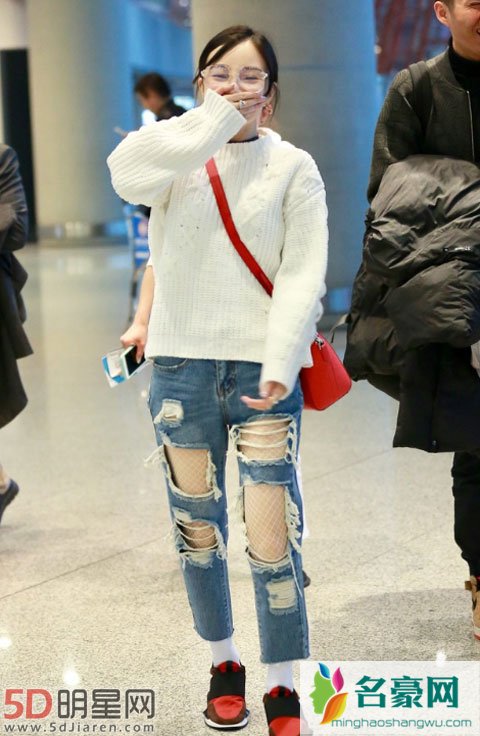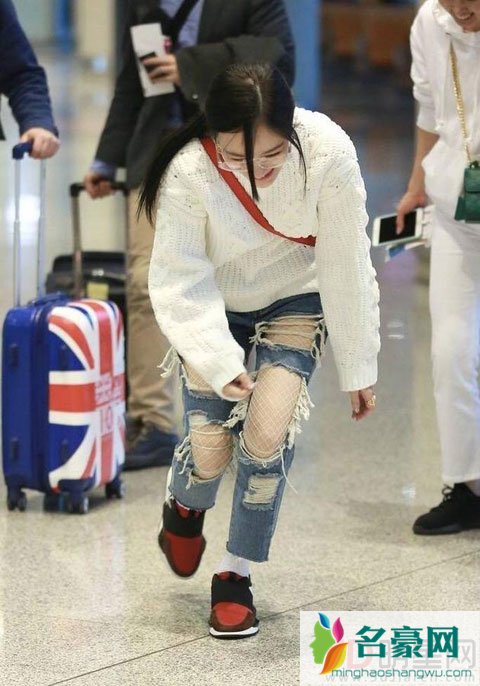 3月28日李小璐现身北京机场一身的潮装,上身穿着白色毛衣,脖子上带着黑色的颈圈,下身穿破洞渔网牛仔裤,脚上穿着红色平底鞋,带着一副眼镜背着一个红色的包包,走起路来十分的随性又性感。但是原本走的好好的她美美哒的在接受媒体们的拍照,却不知为何在平坦的大理石地板上穿着运动鞋还踉跄了一下,不过幸好没有摔倒,但站好后的李小璐不好意思的掩嘴笑了起来,真是被自己蠢哭了,贾乃亮赶紧转发娱乐微博。