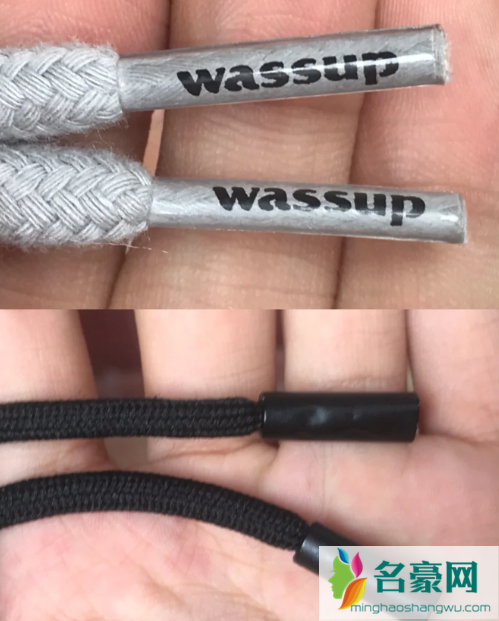 真的卫衣抽绳头处上有WASSUP的小标