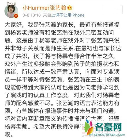 张艺瀚的家长在微博中长文澄清了近日引发热议的杨幂没有和张艺瀚在戏外亲密互动问题,表示:“这是由于杨幂老师在戏外对于张艺瀚来说并非母子关系而是师生关系。”最初家长在一起也达成了共识,认为在合作的半年之久,戏外长时间接触会影响孩子的拍摄状态,所以才会让张艺瀚尽可能的在戏外与杨幂少接触一些,最后孩子能有很好的表现也是因为向老师学习到了认真工作的态度,对杨幂老师的配合也感激不尽,由于孩子还小,语言表达能力可能有限,而媒体断章取义的报道是在诋毁杨幂老师,希望大家保持冷静不要轻易受人挑唆。